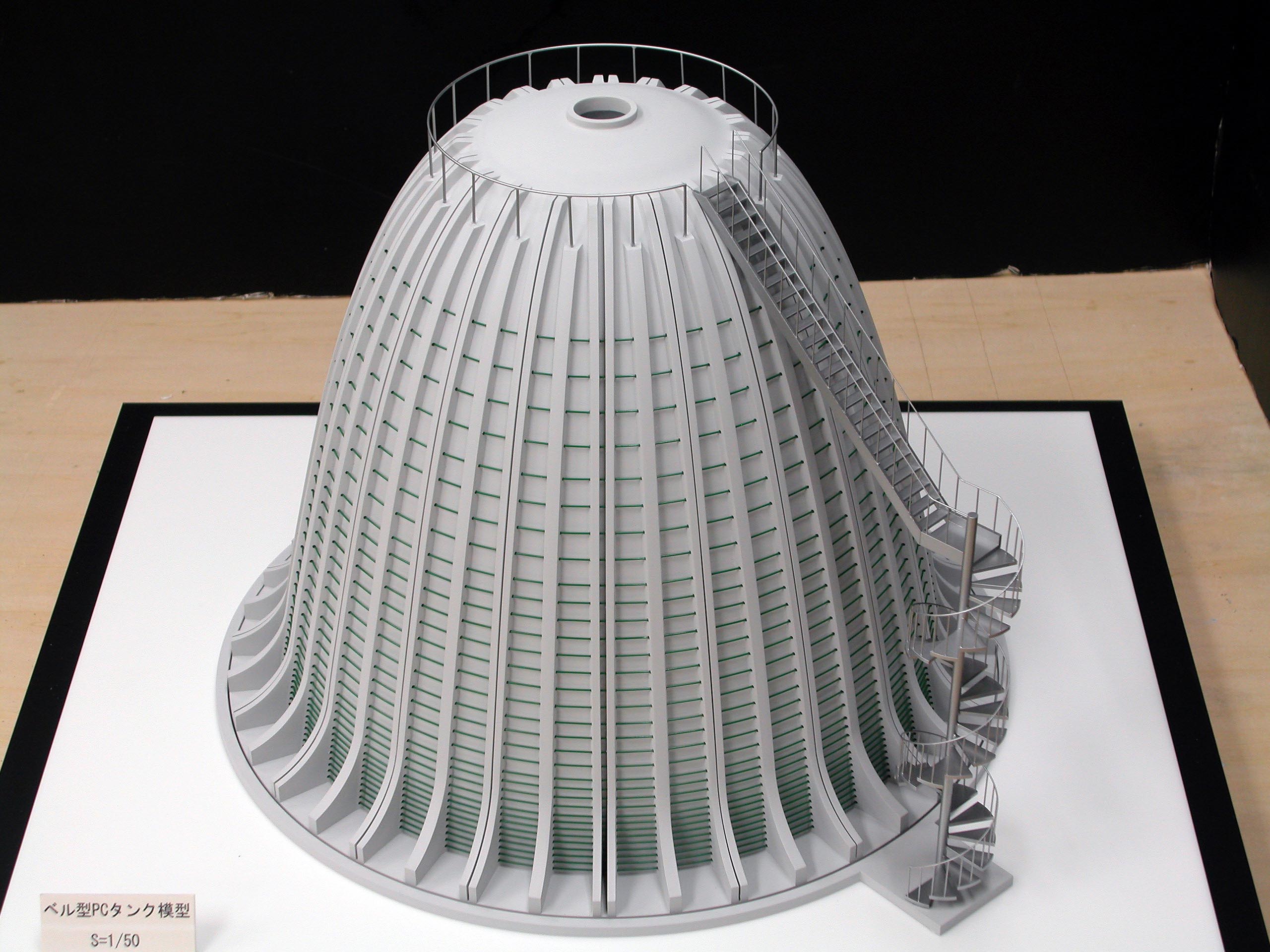 側壁と屋根部材を一体化したプレキャストセグメントでベル形に築造する新しいタイプのPCタンクです。実物と同じ組立方法で製作しました。