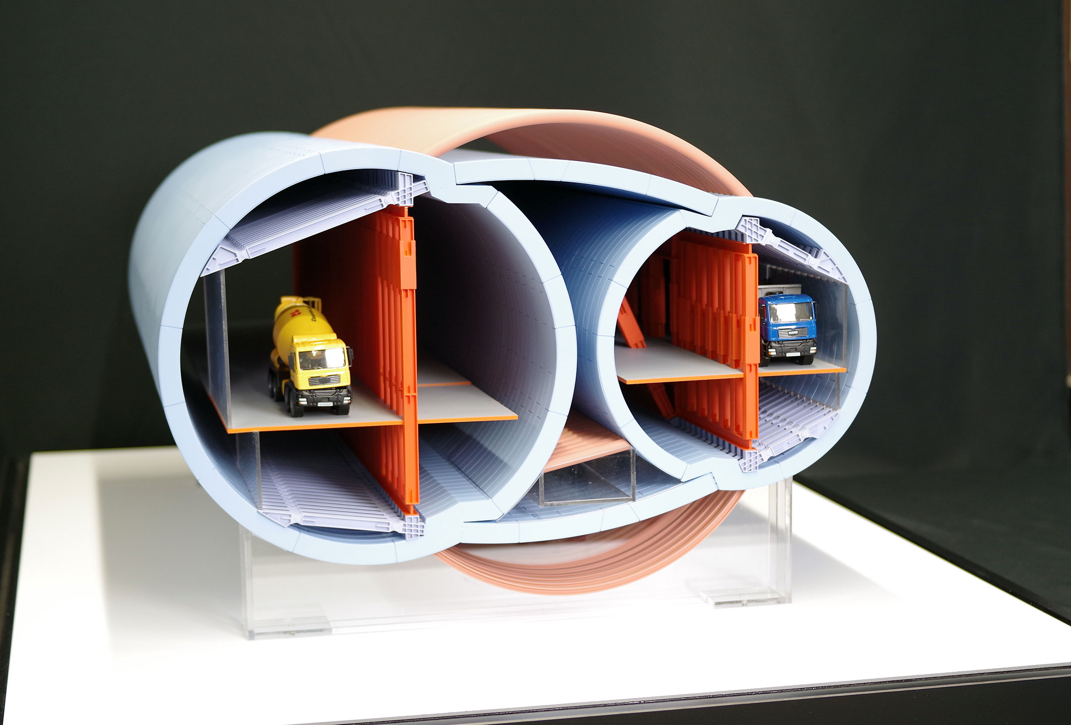 連結路トンネルとは、高速道路の本線トンネルから分岐・合流するトンネルのことで、その内部構造を模型にしています。連結路トンネルの建設には、シールド工法や非開削切開き工法など、様々なトンネル工法が用いられます。