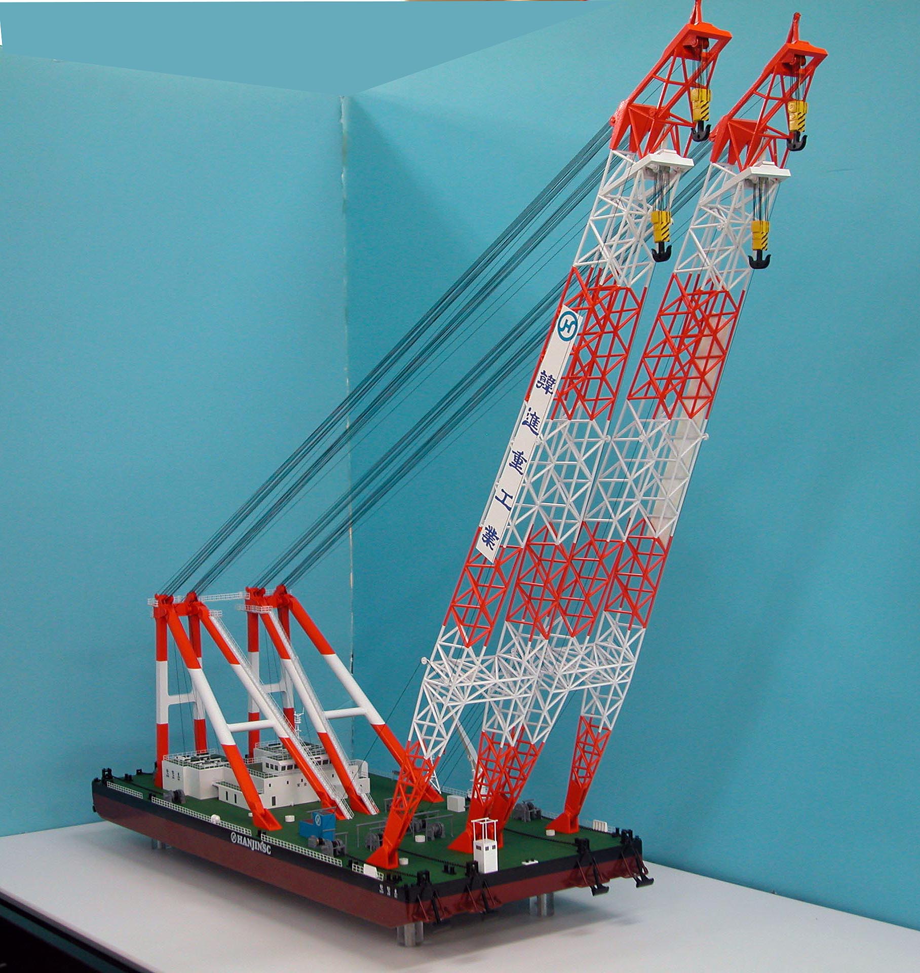 フローチングクレーン船模型 金属を半田して製作しています。職人による半田の技術で出来たものです。金属の塗装はプライマーを塗った上で本塗装をします。プラスチック加工と金属加工を合体させて作られています。