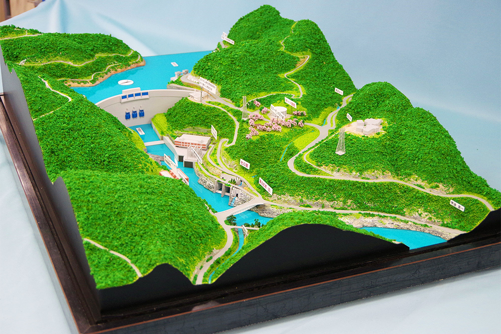 地図データを基に、地形、ダムをNC工作機で切削して製作しています。縮尺1/500 模型サイズ1400mm x 740mm