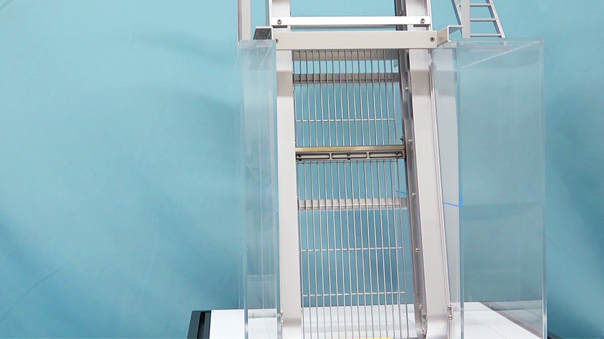 除塵機に取付けたレーキがエンドレスに回転する動きを表現しています。動きの特徴は大きな異物に詰まることなく回転できるところです。