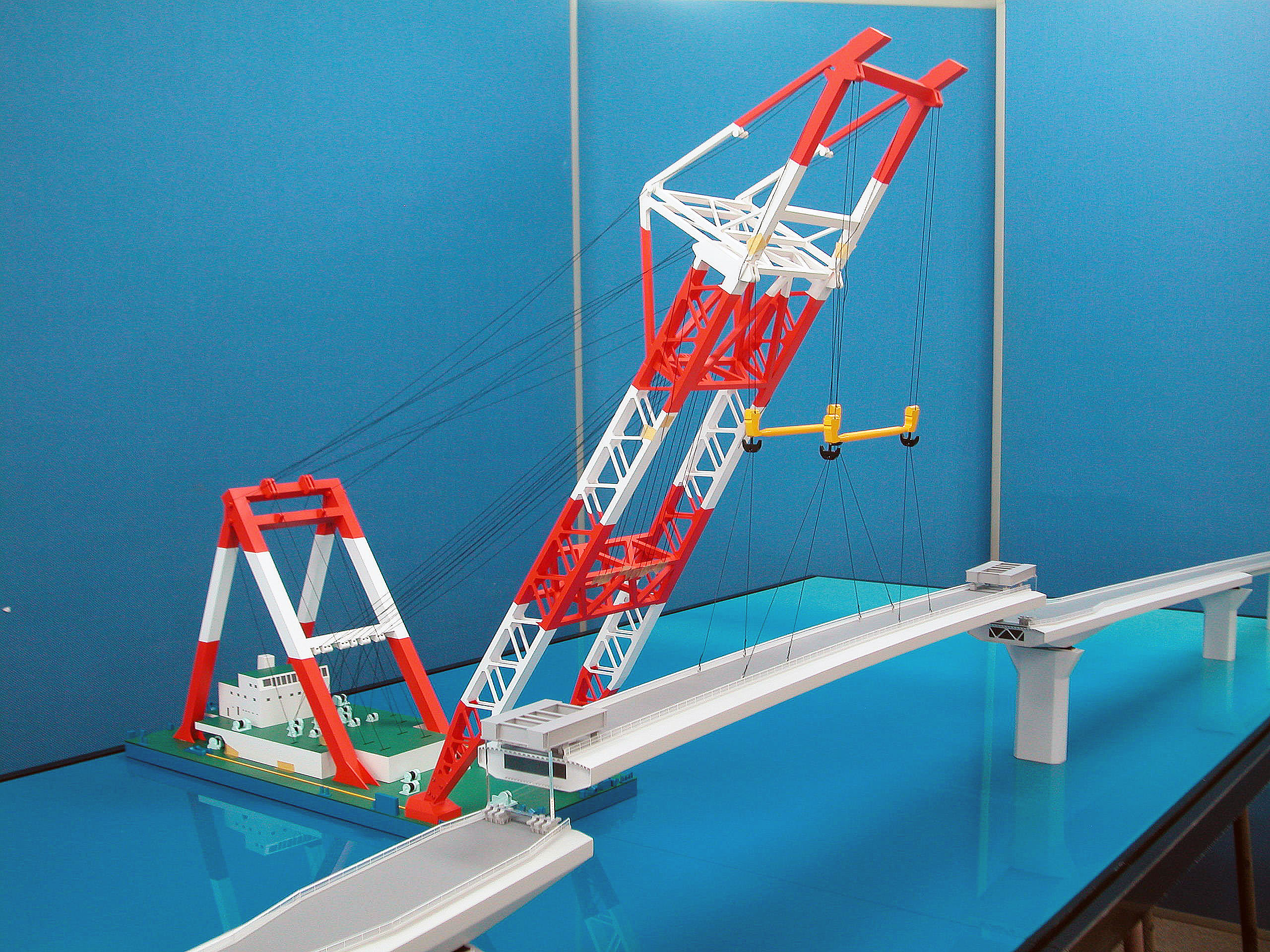 宮古島と伊良部島を結ぶ橋の施工状況模型です。両方の島から架設して、最後の上部工を設置するために大型のクレーンで吊り下げて設置する様子を模型で説明をしています。