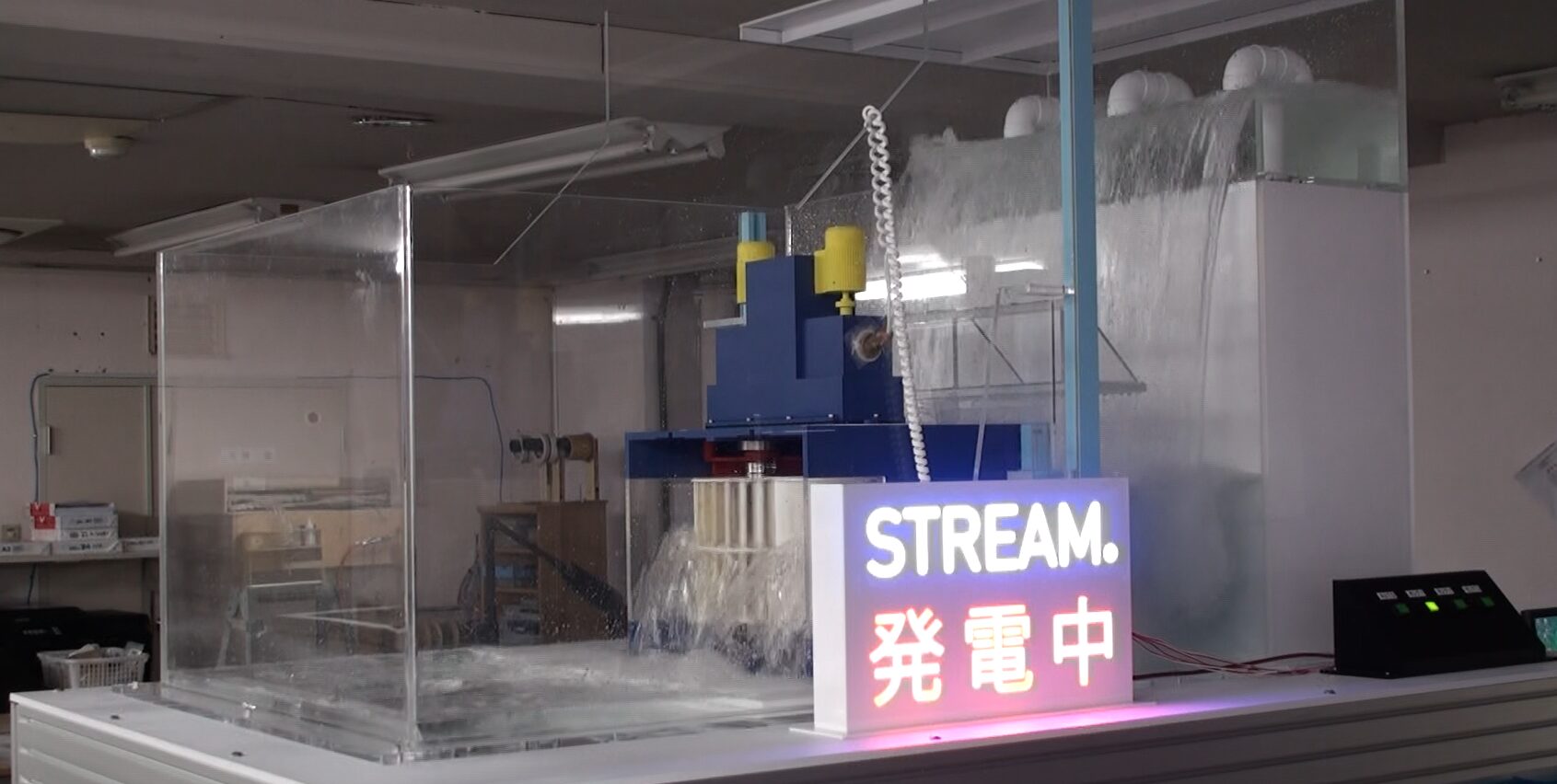 水流によりタービンを回転させて、実際に発電する様子を表しているデモ機です。