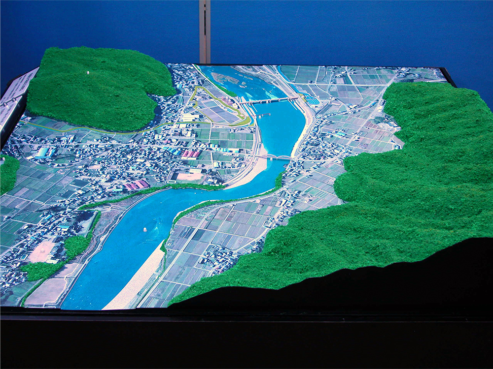 航空写真を用いて製作しています。写真をベースに川、山、橋梁、堰堤をNC工作機で製作し、合成させて模型にしています。縮尺1/500 模型サイズ1400㎜ x 1400mm