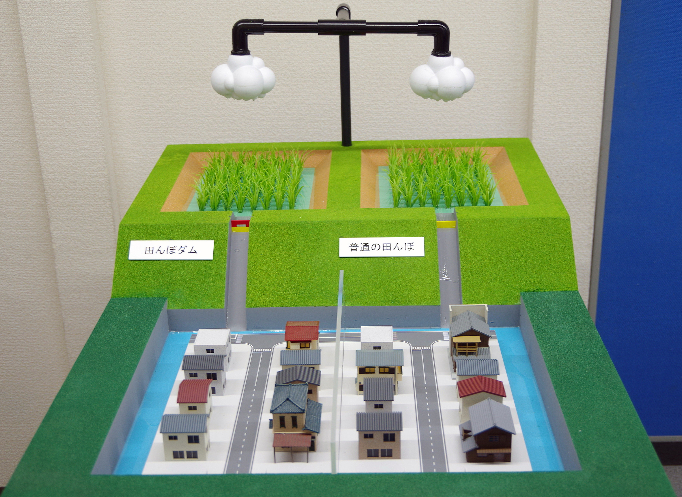 大雨が降った時に、一時的に田んぼに水を蓄えて、川に大量の水が一気に流れて氾濫するのを押さえる様子を、普通の田んぼと比較しています。
