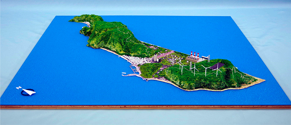 航空写真と地図データを合成したものに、NC工作機で切削した地形を組み合わせて製作しています。