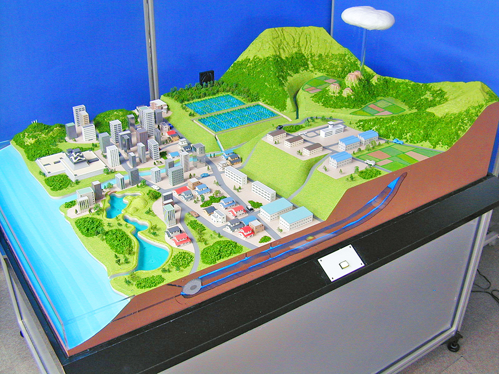 実際の水と電飾を使って、水の流れを表現しています。分かり易くデフォルメしたり、縮小したりしてノンスケールで1つのジオラマにまとめています。模型袴の中に水槽を設置してポンプで水を循環させています。