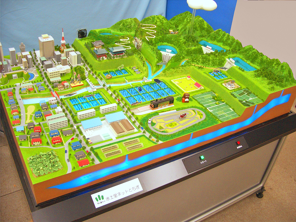 お客様が描いたイラストを基にして模型を構成しました。水を使って豊かな里を表現しています。サイズ 1550mm x 1200mm